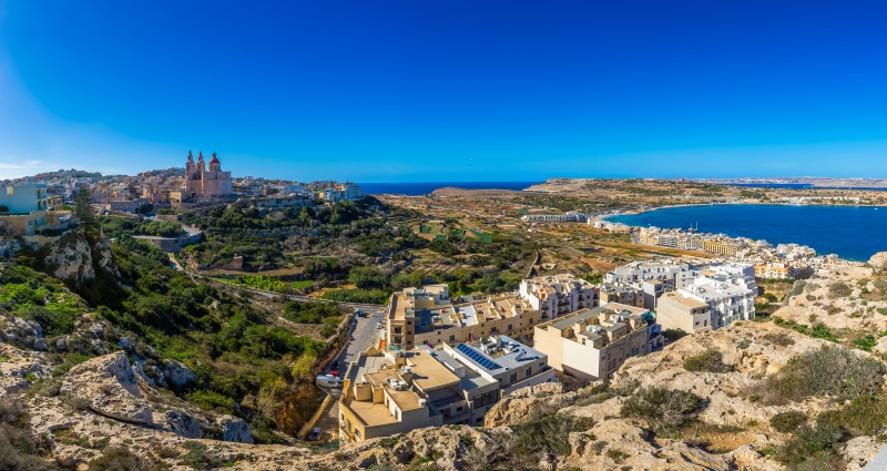 We sluiten de top 10 mooiste stranden op Malta af bij Marsaforn. Dit strand ligt aan de noordkust van Gozo en hier vind je geen grote all-inresorts of toeristische drukte, maar een charmante baai vol vissersbootjes, laagbouw en een lange promenade met uitzicht op eindeloos blauw. In de zomer is het levendig, in de winter heerlijk rustig. De sfeer? Tikkeltje retro, op een fijne manier. Je wandelt zo van je appartement naar zee, haalt een espresso bij de bar op de hoek, en voor je het weet lig je te dobberen in kraakhelder water. De baai zelf wordt omlijst door groene heuvels en kleurrijke bootjes, en op de achtergrond zie je de toren van de Sint-Pauluskerk boven alles uitsteken – typisch Marsalforn.